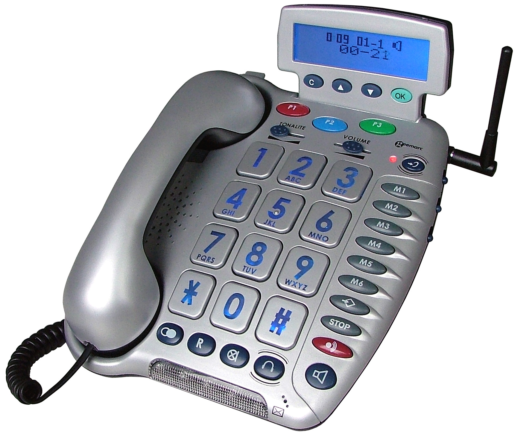 - Larmtelefon: trådlös larmsändare, möjlighet att lagra 6 larmnummer, personligt larmmeddelande