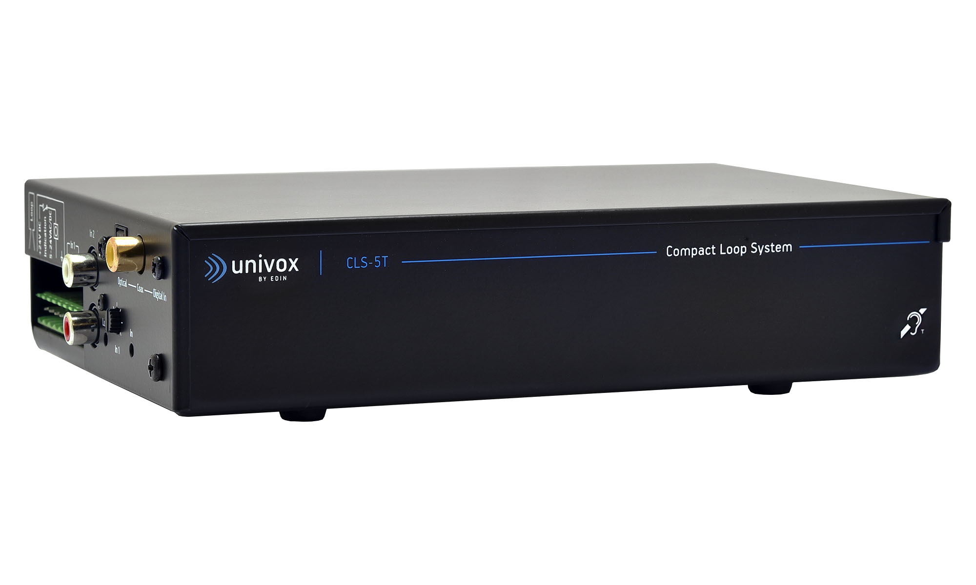Univox CLS-5T är en universiell, kompakt och kraftfull slingförstärkare med digital ingång anpassad och designad för trådlös lyssning genom hörapparat med T-spole. CLS-5T passar utmärkt att använda i både hissar, bussar, i taxi, spårvagn eller båt med 12-24VDC-anslutning såväl som i stora TV-/sällskapsrum och konferensrum med 110-240VAC extern strömförsörjning. En rad ingångar, inklusive digitala och koaxiala, möjliggör enkel integration med valfritt ljudsystem. Ett korrekt installerat CLS-5T slingsystem uppfyller alla krav i IEC 60118-4.