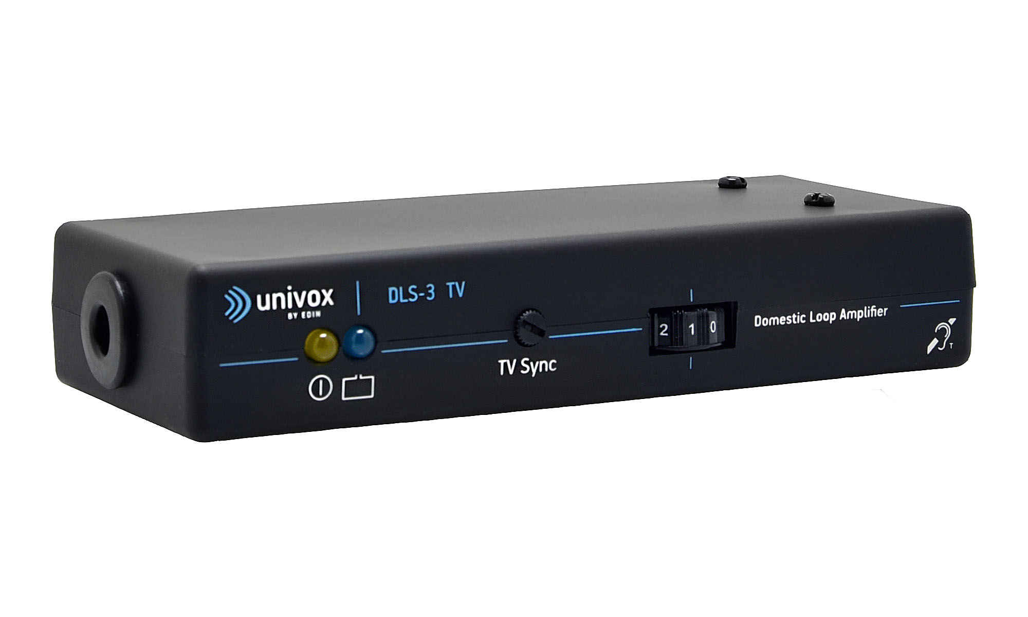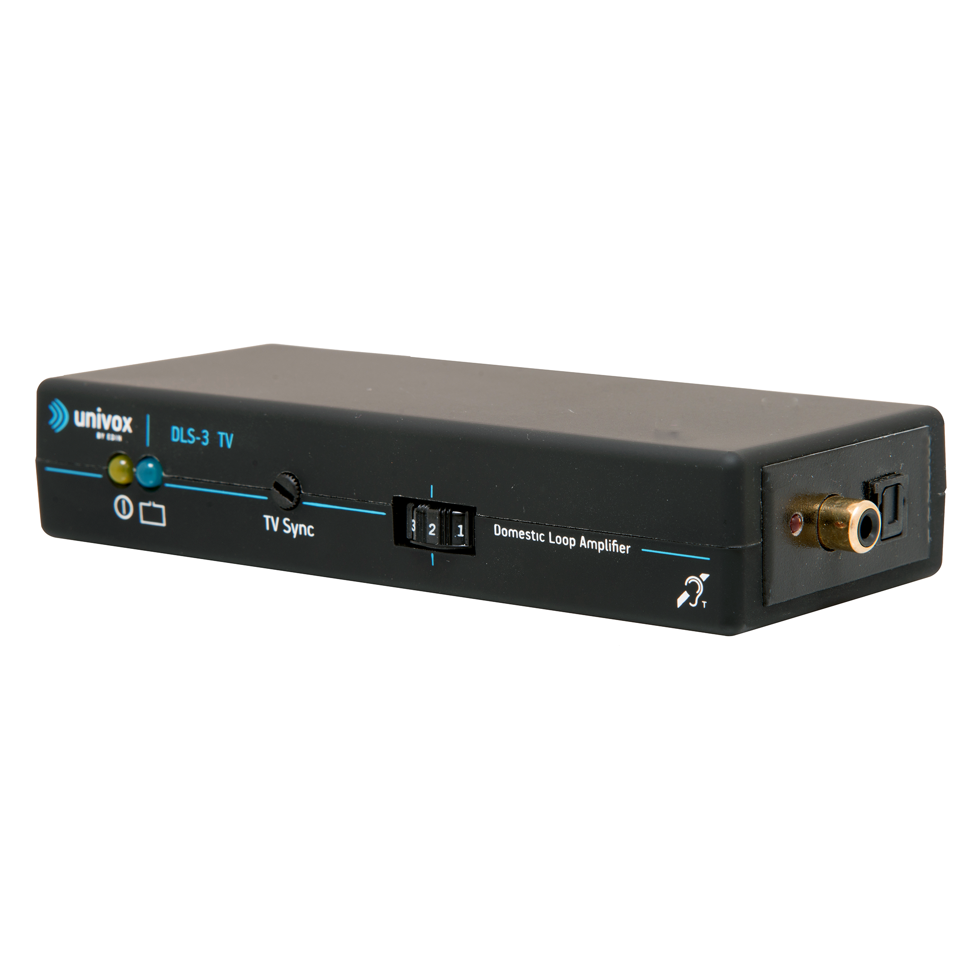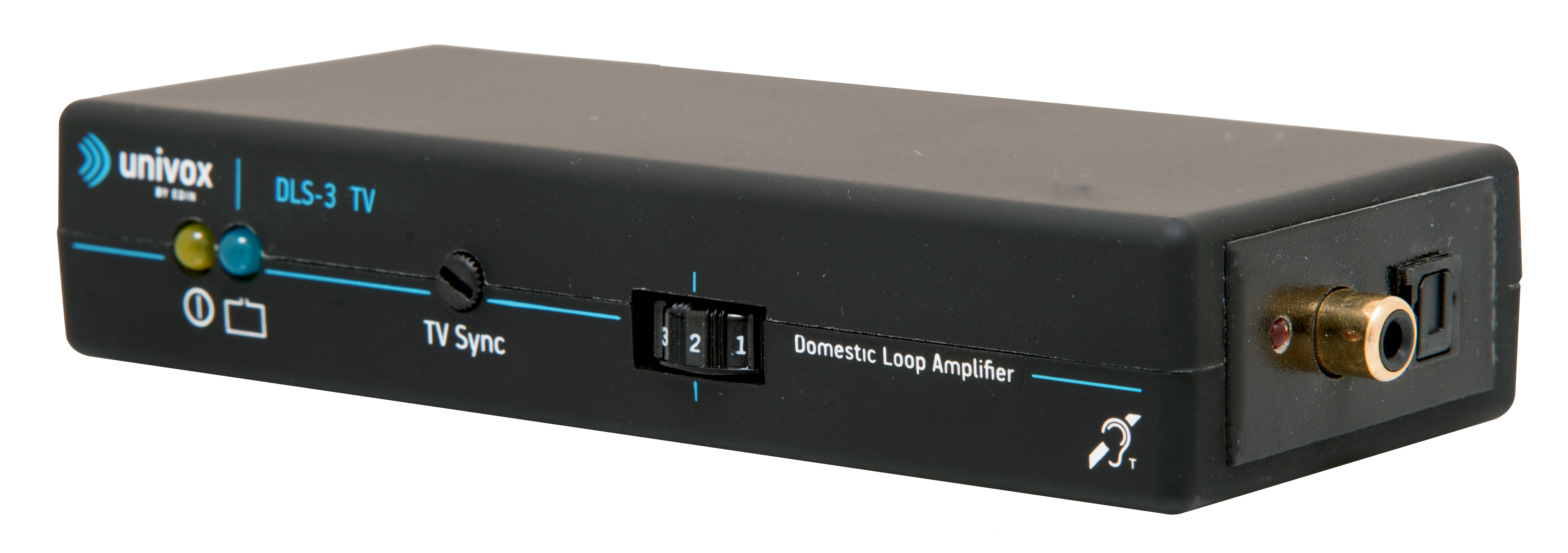 Univox® DLS-3 TV är ett komplett hjälpmedel för hörapparatbärare för att förmedla ljud från TV eller andra ljudkällor. Förstärkaren är speciellt anpassad för LCD-/LED-/plasma-TV med digital utgång.