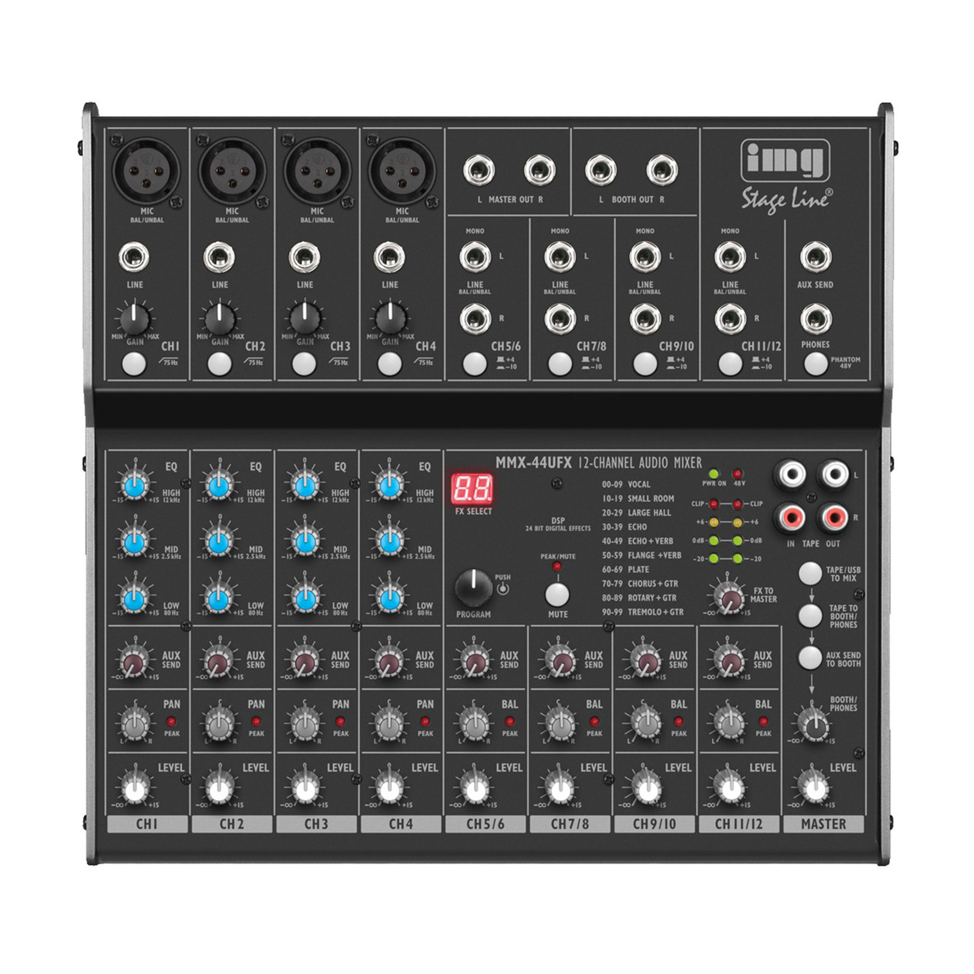 från PC och för inspelning av mixar till PC. - 4 mono-kanaler med gain-, 3-vägs-ton-, low cut and pan-kontroller