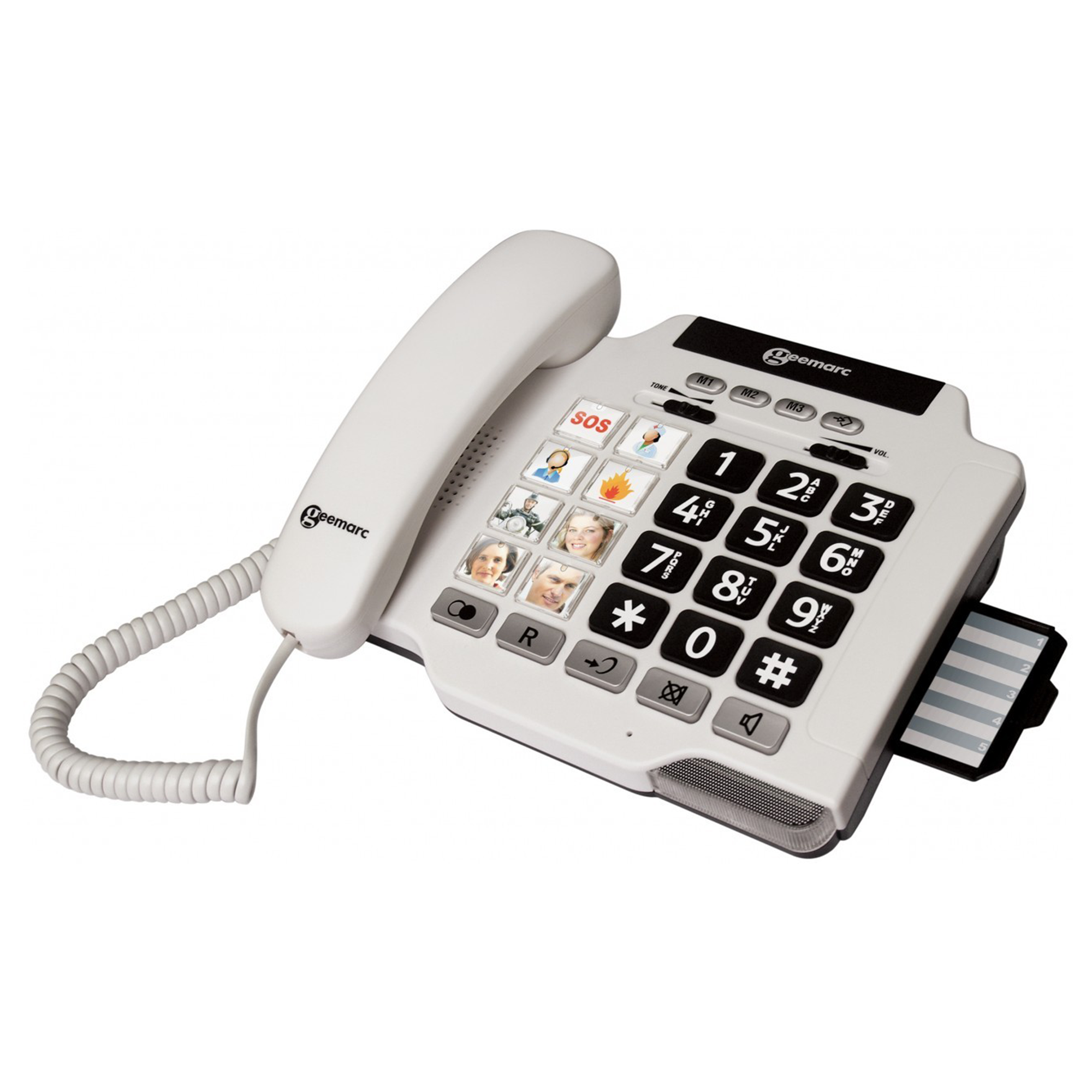 PhotoPHONE 100 har volym- och tonkontroller för personlig inställning. Telefonen har 8 programmerbara kortnummerknappar för telefonnummer du ringer ofta och för att underlätta ytterligare kan du sätta in fotografier under det genomskinliga plastskyddet. På detta sätt kan du ringa personen/platsen på fotot med bara 1 knapptryck.