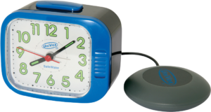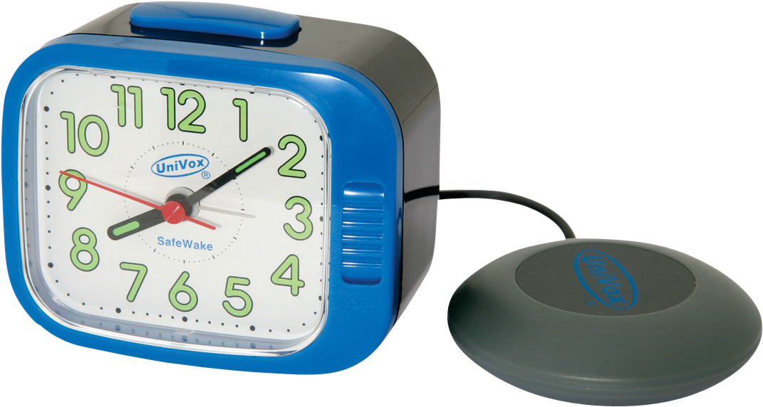 Univox SafeWake är ett smidigt hjälpmedel för hörselskadade som behöver hjälp med att vakna – på hotell eller i hemmet. SafeWake fungerar dels som en vanlig väckarklocka med vibrator som man lägger under kudden, dels som en indikator för utrymningslarm.